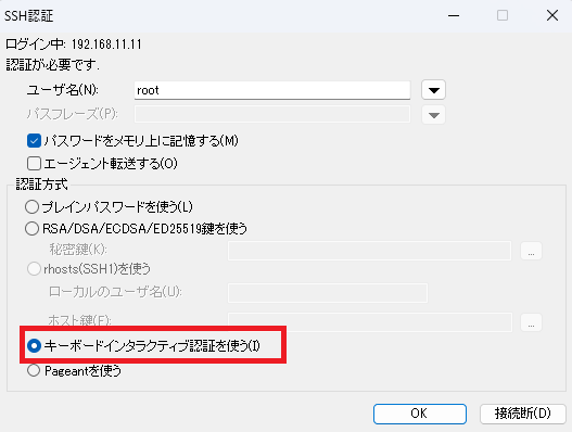 sshは作業完了後に無効化するつもりですので(本番環境で常時有効は安全上好ましくない)、ESXiをメンテナンスモード状態にして、「キーボードインタラクティブ認証を使う」(Teratermの場合)を使用してrootでログインします。