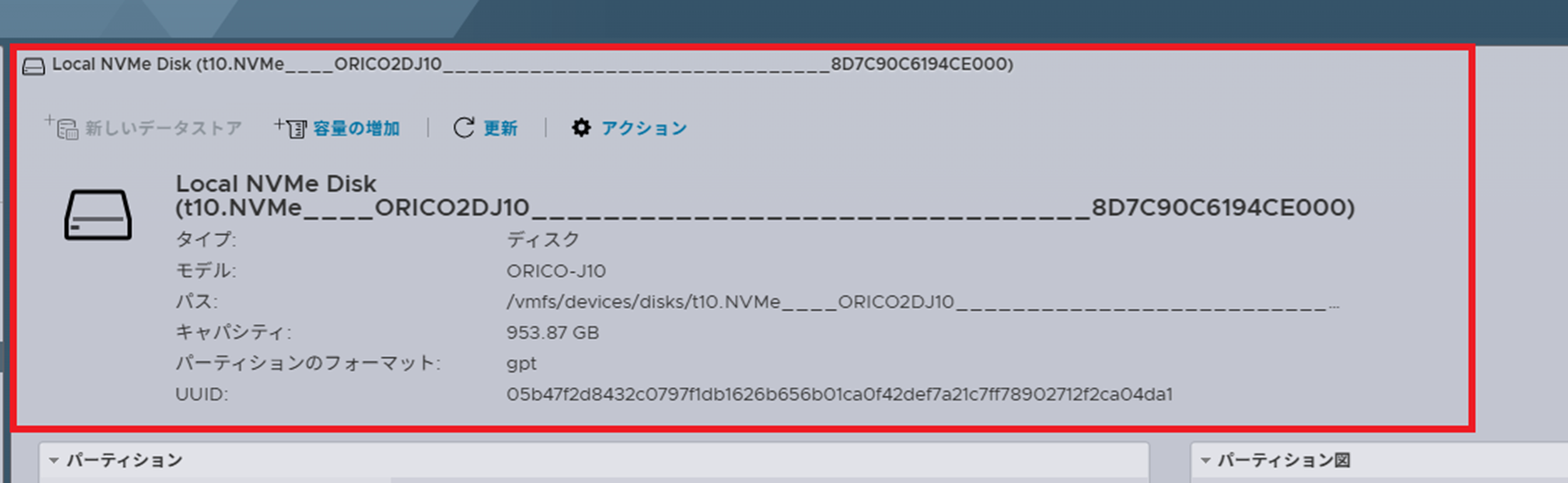例:esxcli system tierdevice create -d /vmfs/devices/disks/t10.NVMe____ORICO2DJ10_______________________________8D7C90C6194CE000
